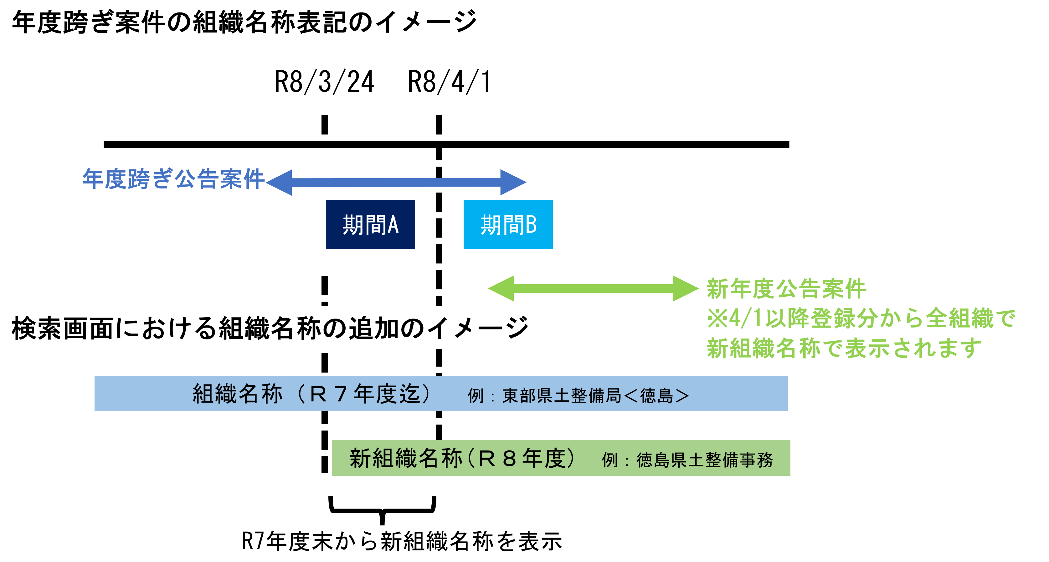 入札手続き期間が令和8年4月1日を跨ぐ案件(年度跨ぎ案件)については、以下の通り期間によって組織名称の表記が異なります。 入札手続きに当たってはご注意ください。