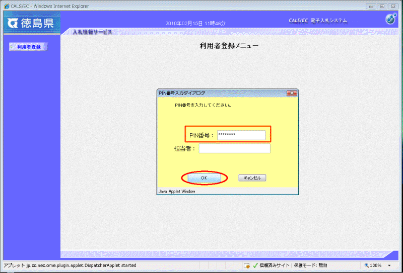《PIN番号入力ダイアログ》(認証画面)が表示されます。